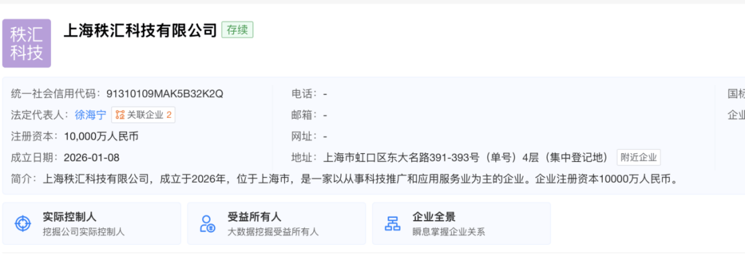 而上海秩汇明德企业管理中心(有限合伙)则是一家于2025年12月22日成立的新主体,注册资本为1500万元,由李志骞与徐海宁分别以97%和3%的比例出资。